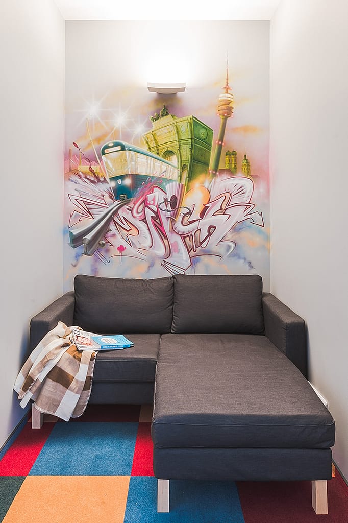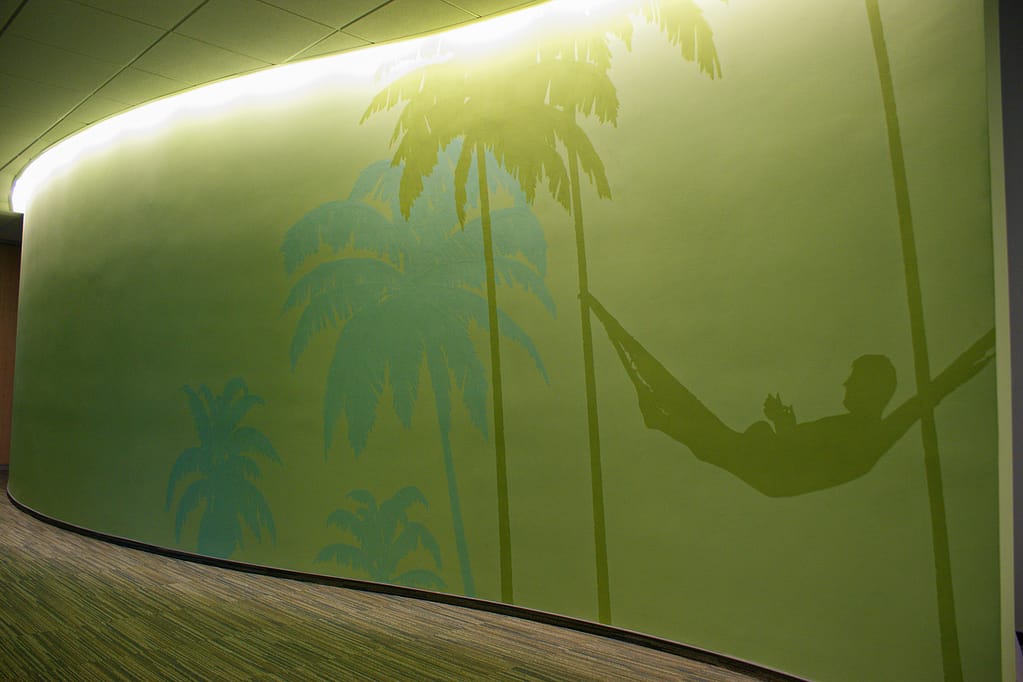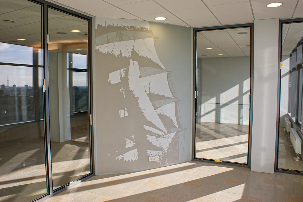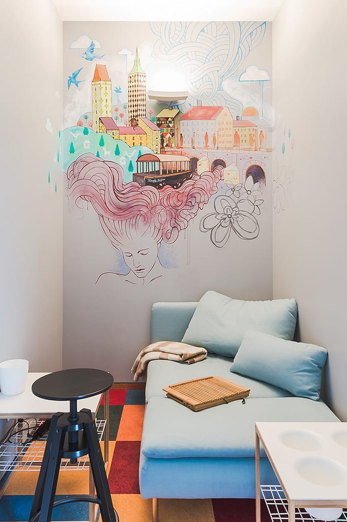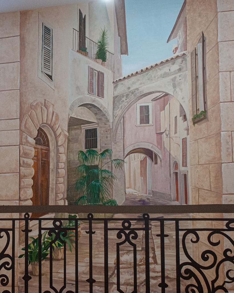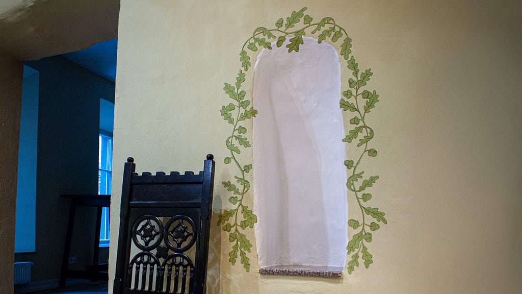Autentiškose Vilniaus senamiesčio dvaro erdvėse sukūrėme patriotiškos tematikos piešinį. Kompozicijos ašis – ant lubų nutapytas didingas Vyčio herbas, apsuptas dekoratyvinių motyvų. Sienų nišas papuošėme ąžuolo lapų ornamentika, o tą patį motyvą pratęsėme ir aplink šviestuvus, taip subtiliai sujungdami viską į vientisą erdvę. Tokio pobūdžio tapyba ant lubų pareikalavo profesionalumo ir daug fizinių pastangų, todėl procesui reikėjo didelio susikaupimo bei atidumo.