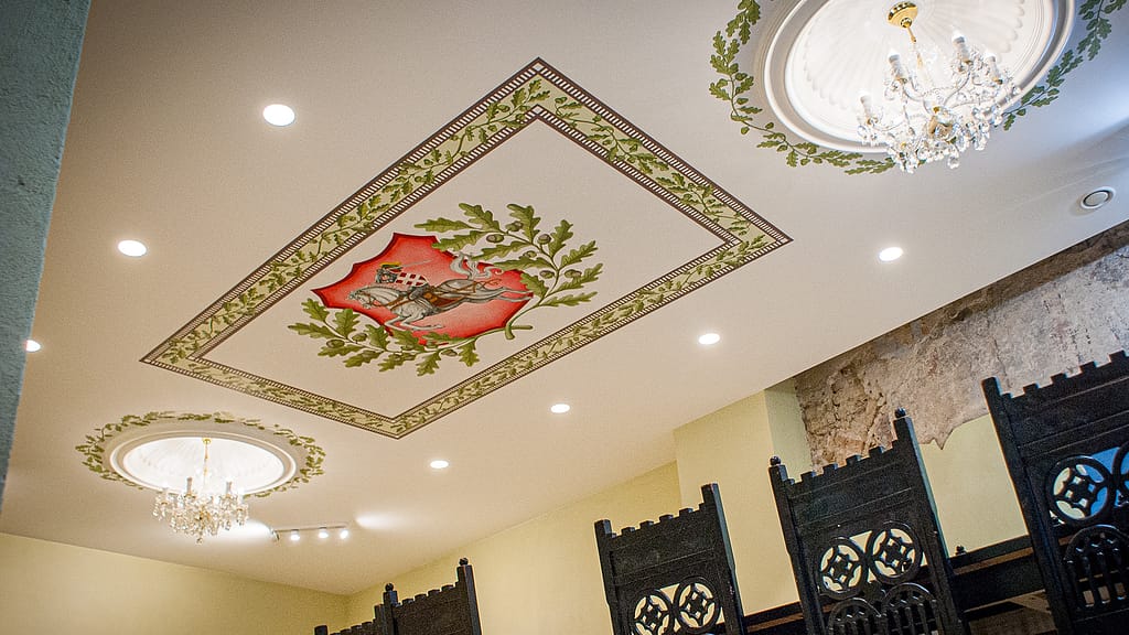 Autentiškose Vilniaus senamiesčio dvaro erdvėse sukūrėme patriotiškos tematikos piešinį. Kompozicijos ašis – ant lubų nutapytas didingas Vyčio herbas, apsuptas dekoratyvinių motyvų. Sienų nišas papuošėme ąžuolo lapų ornamentika, o tą patį motyvą pratęsėme ir aplink šviestuvus, taip subtiliai sujungdami viską į vientisą erdvę. Tokio pobūdžio tapyba ant lubų pareikalavo profesionalumo ir daug fizinių pastangų, todėl procesui reikėjo didelio susikaupimo bei atidumo.